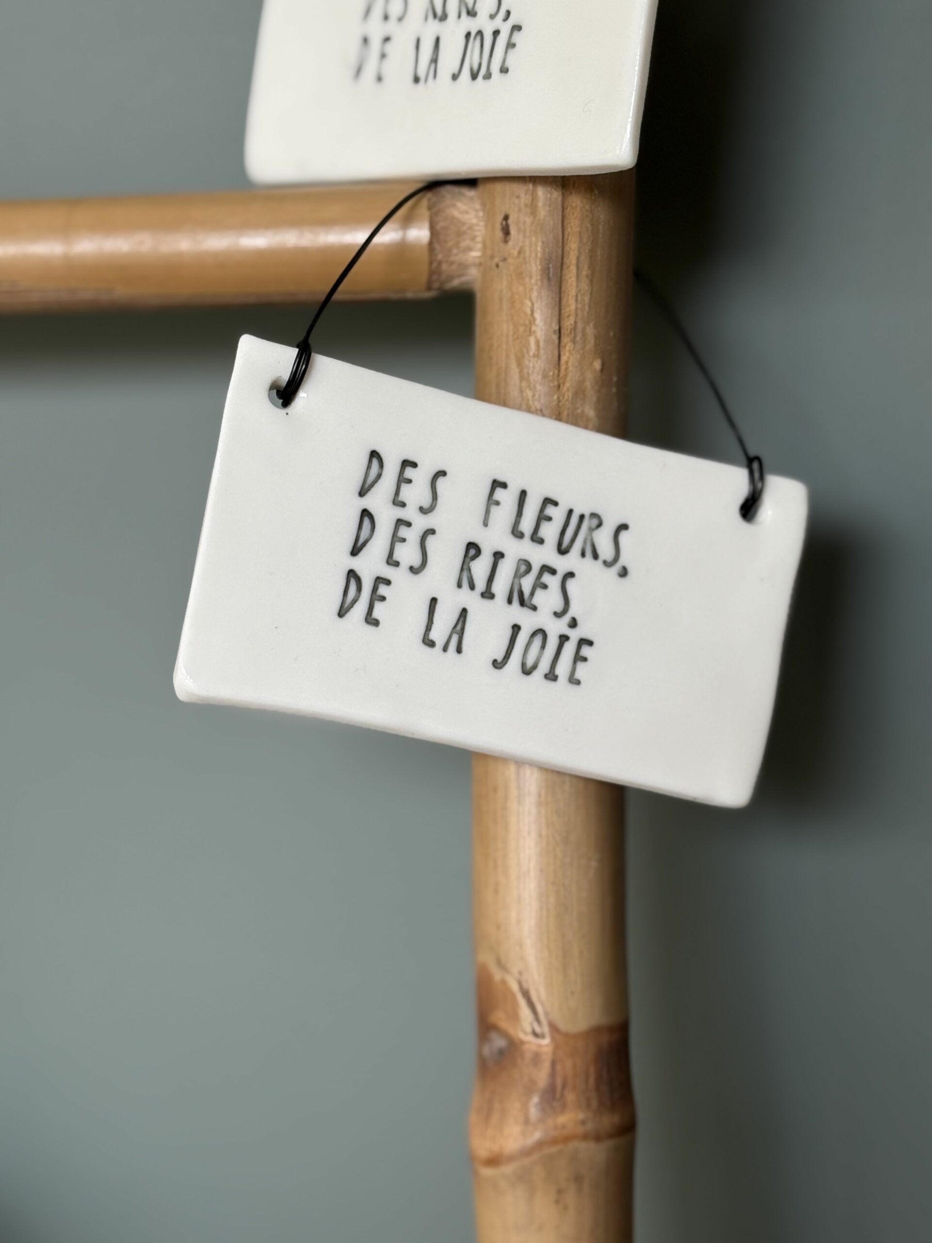 Plaques « mot doux », façonnés à la main. Aucune pièce ne se ressemble, c’est la magie de l’artisanat 🙂