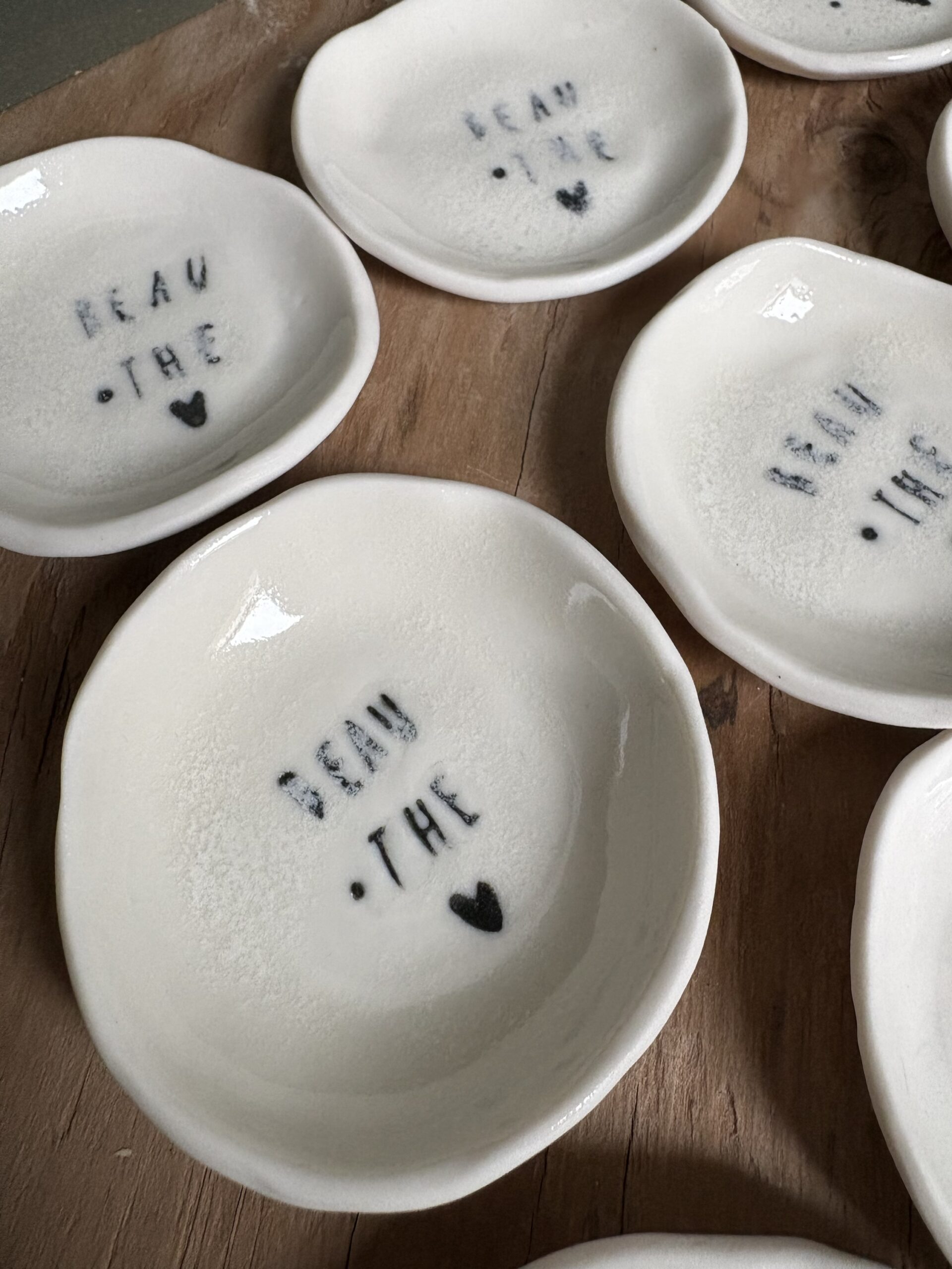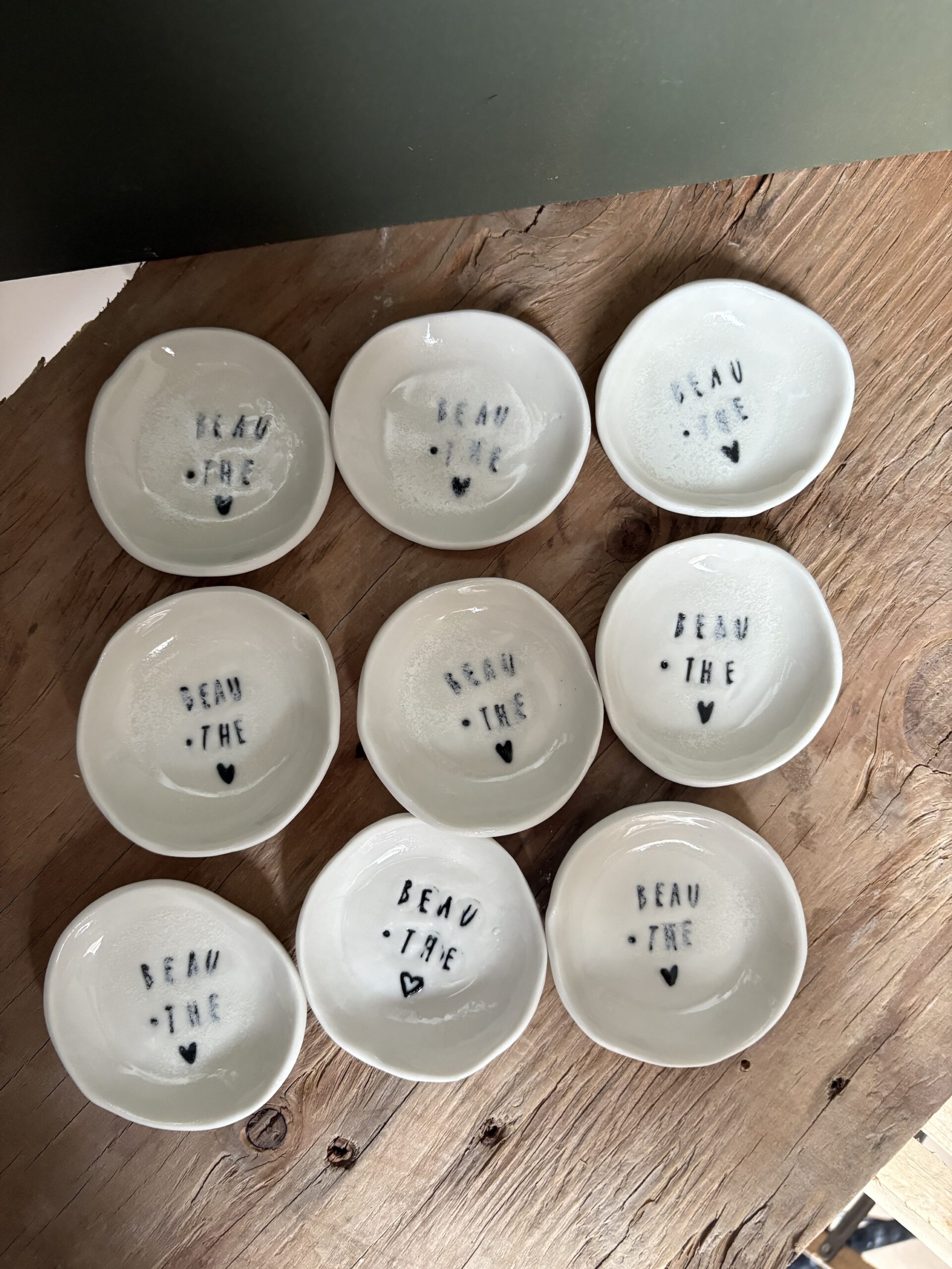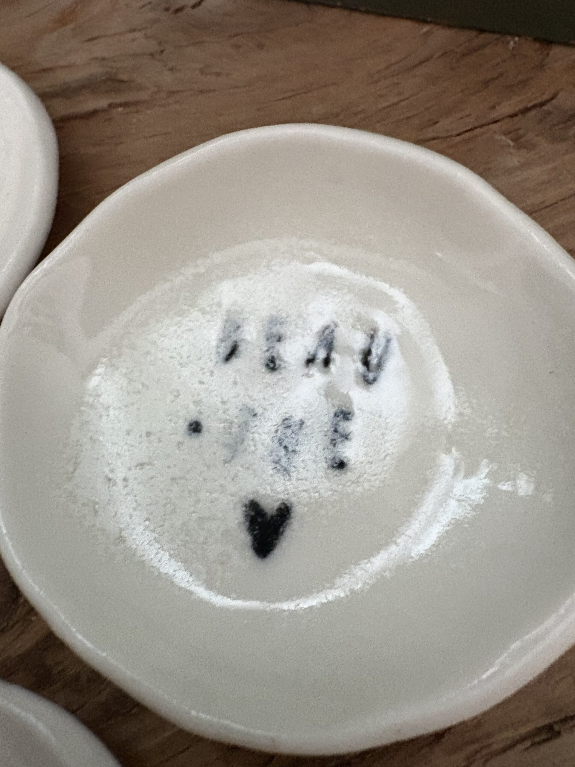 Il s’agit d’une pièce imparfaite : il y a eu trop d’émail dessus qui cache un peu le mot… Mais le repose-thé est tout a fait utilisable.