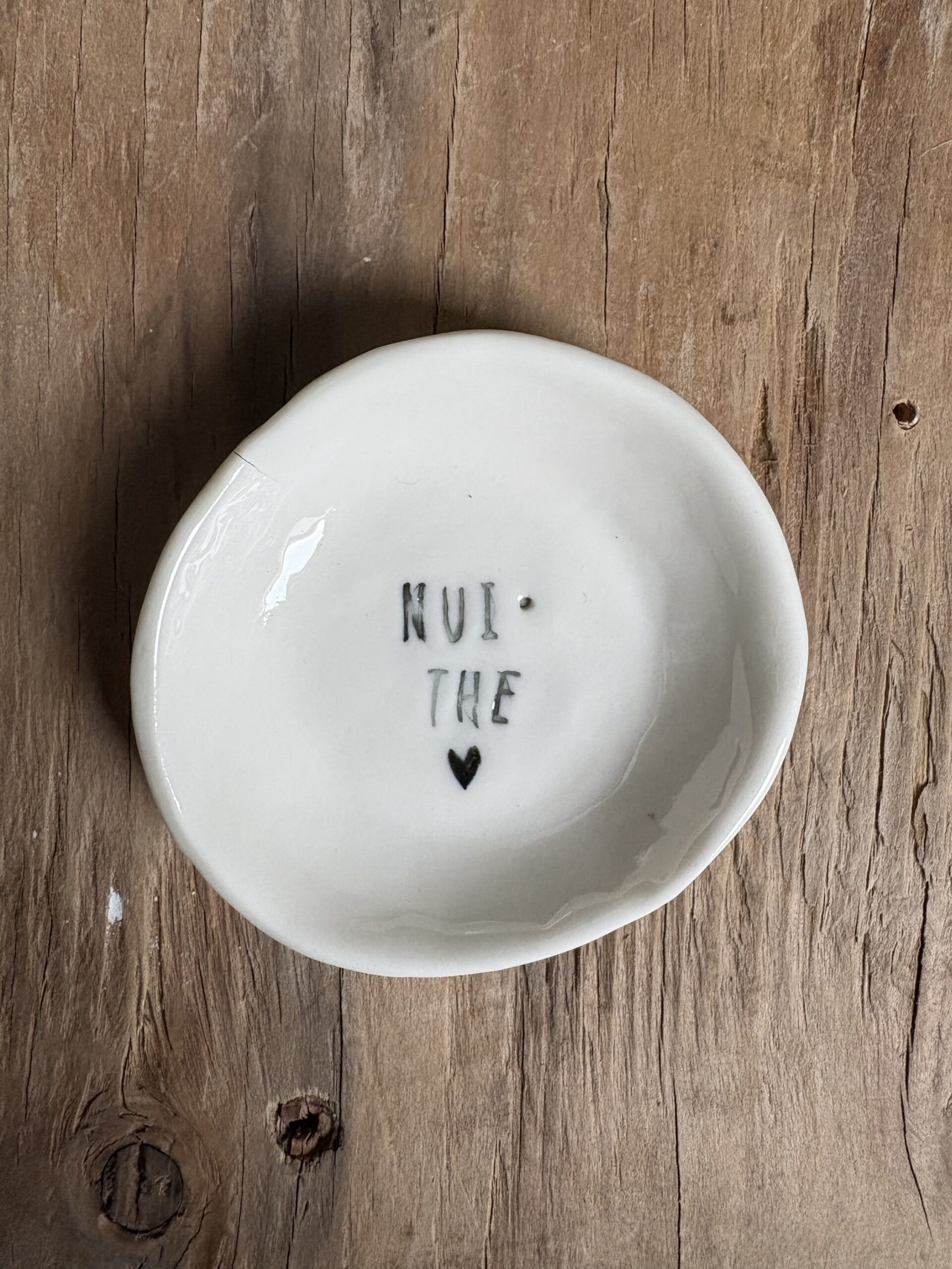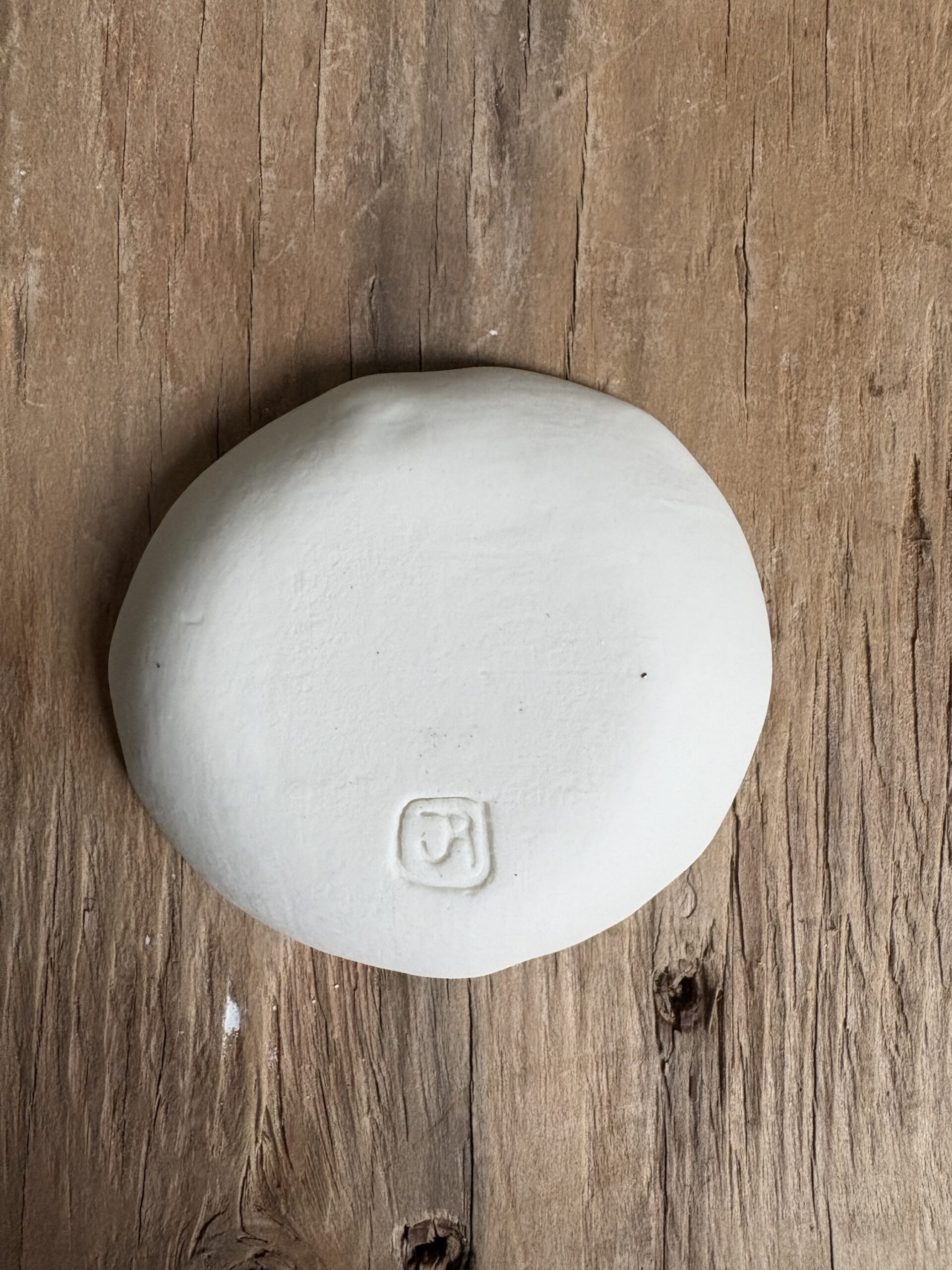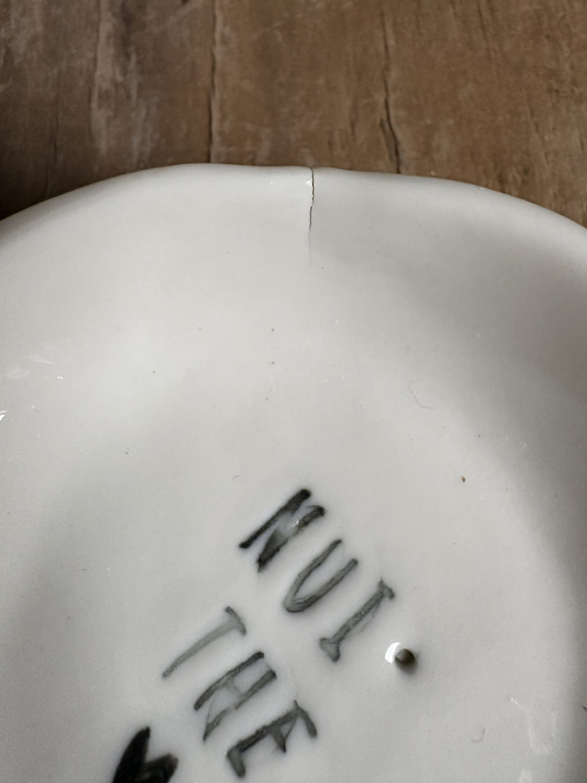 Il s’agit d’une pièce imparfaite : en cuisant, le bord s’est légèrement fissuré… Le repose-thé est tout a fait utilisable.