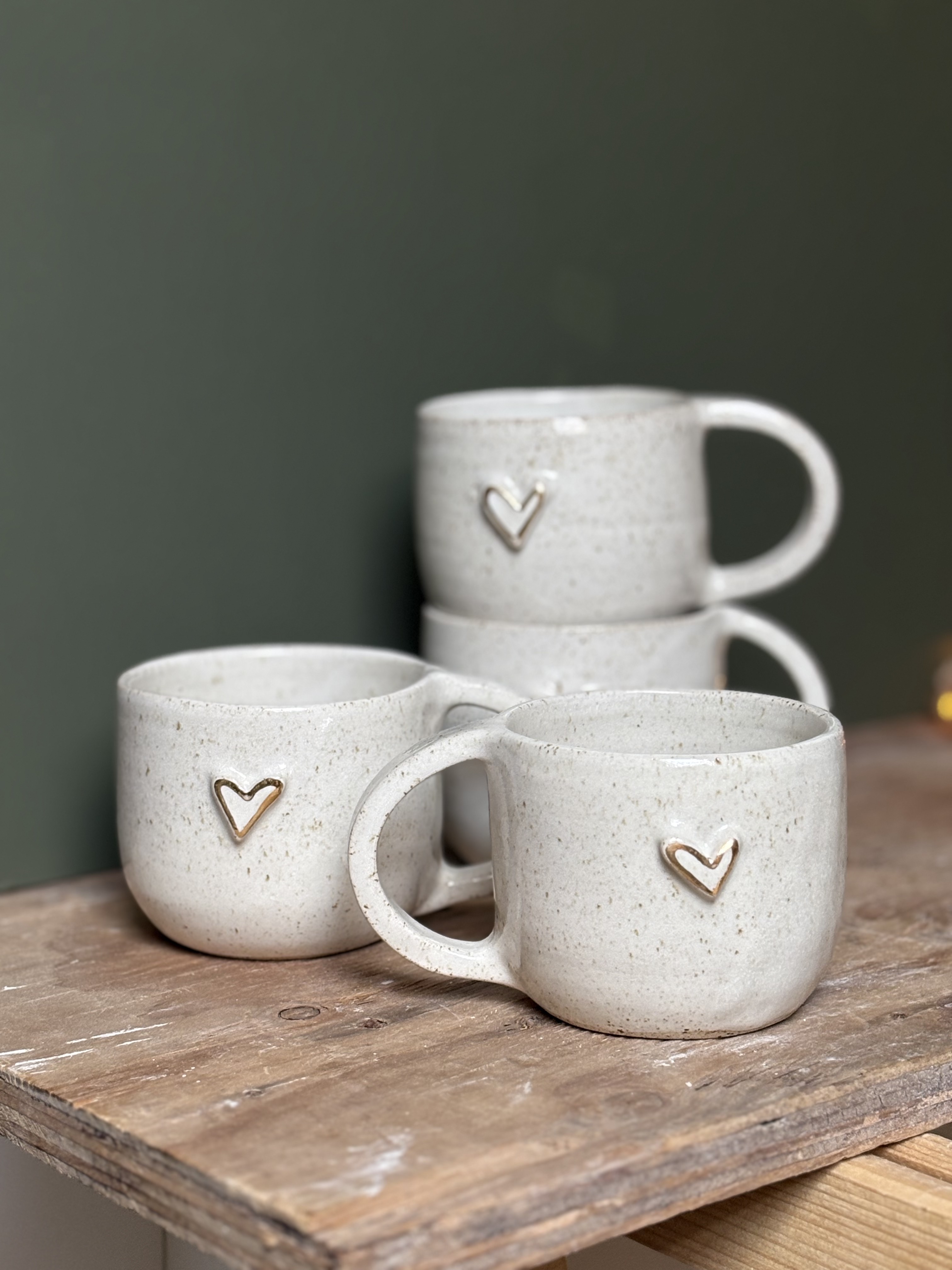 Tasses façonnées à la main et cuites à 1250°c. Il y a 2 coeurs sur la tasse, un de chaque coté. L’or (24 carats) est appliqué à la main, au pinceau sur chaque pièce.